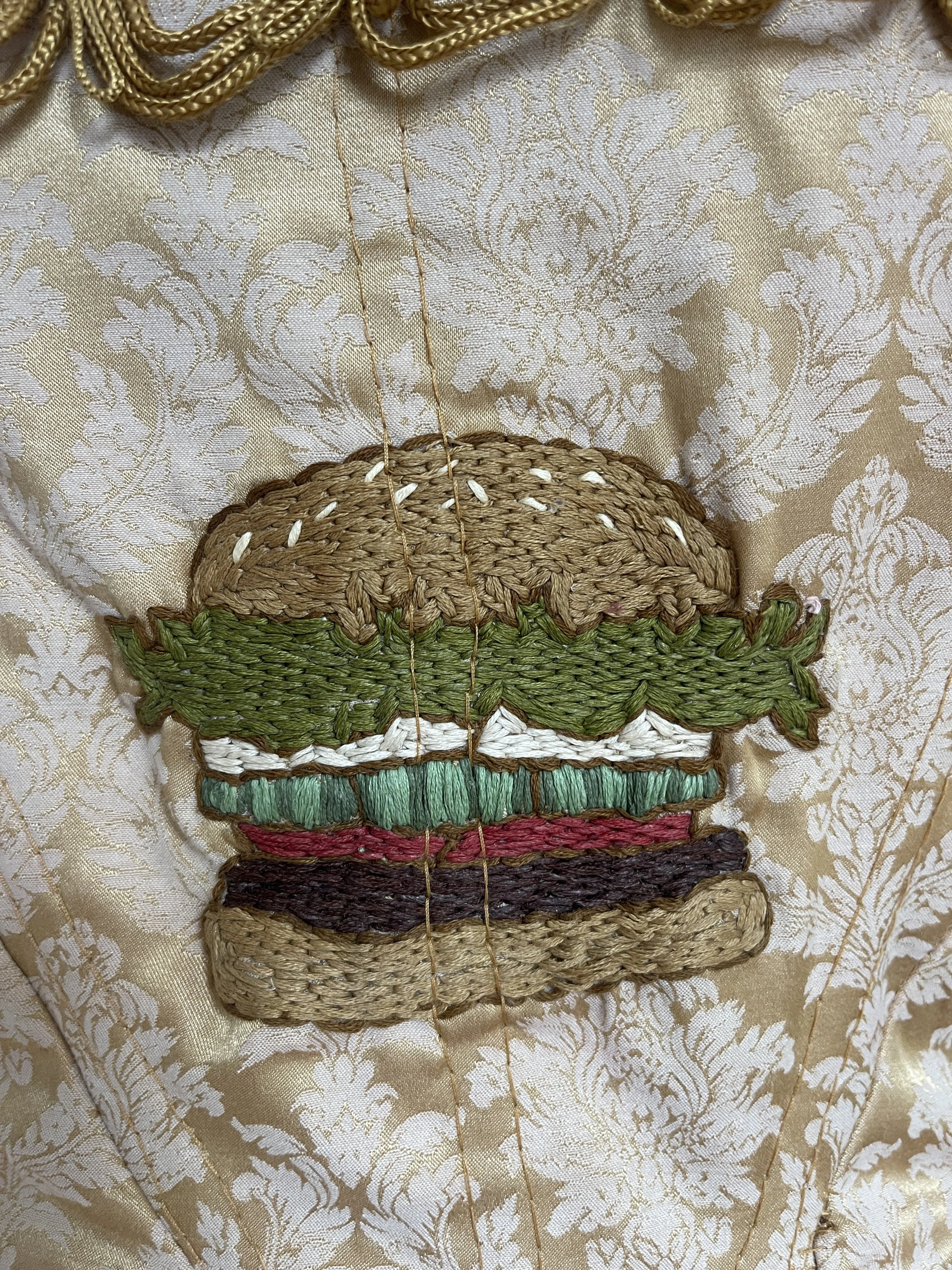 Tudor inspired corset for a Burger Queen Halloween costume.